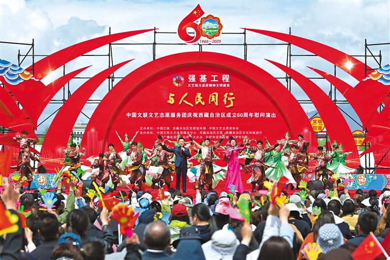 上午10時(shí)整,“與人民同行”中國文聯(lián)文藝志愿服務(wù)團(tuán)慶祝西藏自治區(qū)成立60周年慰問演出,在歌舞《鼓舞西藏》的熱烈氛圍中正式開場(chǎng)。