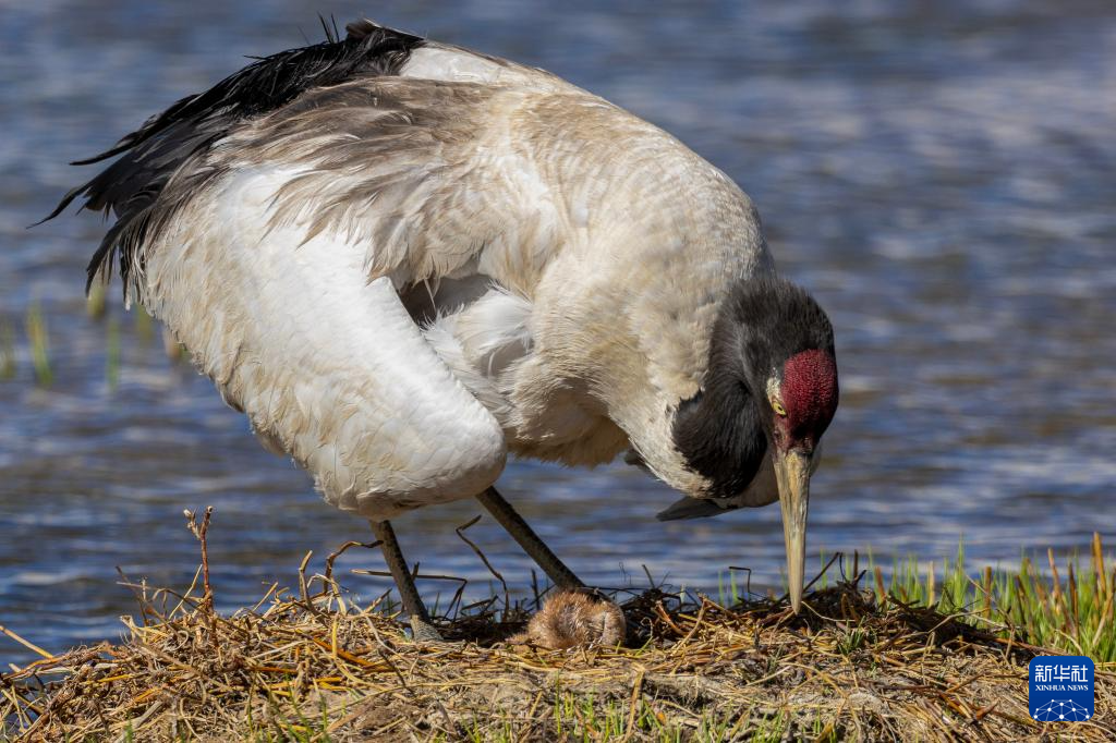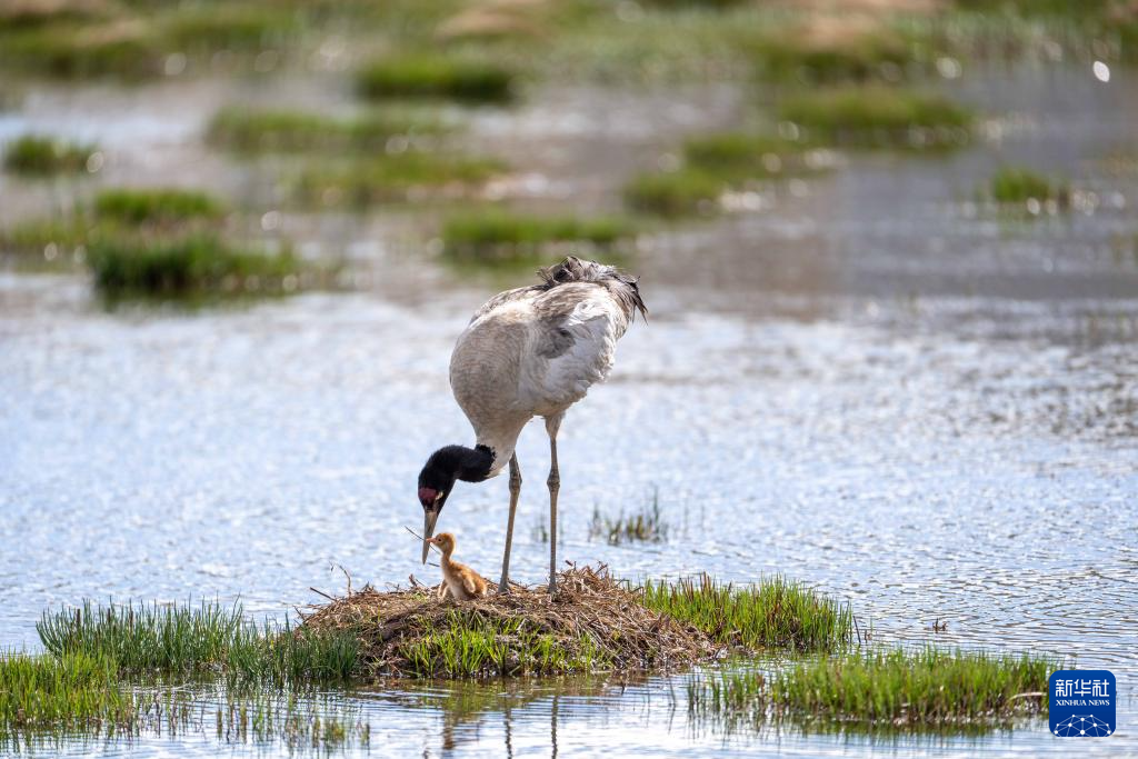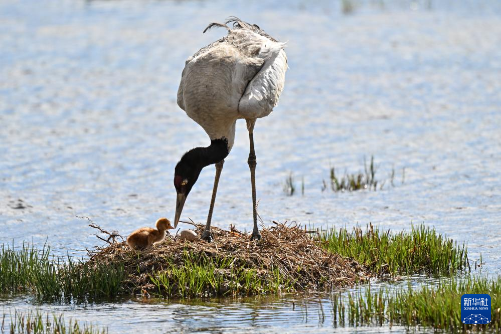 6月4日,在西藏那曲市申扎縣,一只黑頸鶴查看剛出生雛鳥的情況。新華社記者 孫瑞博 攝