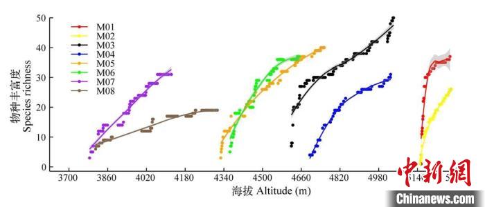 珠峰絨布河流域各個山體累計物種豐富度沿海拔高度的變化。M01–M08表示絨布河上游到下游所調(diào)查的8個獨立山體。中國科學院青藏高原研究所 供圖
