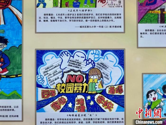 圖為拉薩市檢察院未成年人檢察部走廊里展示的孩子們用畫筆描繪的法治主題作品。謝牧 攝