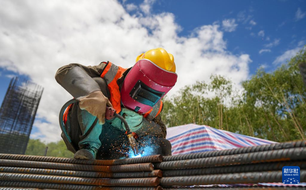 工人在薩熱路跨江大橋建設(shè)現(xiàn)場焊接鋼筋(6月18日攝)。新華社記者 晉美多吉 攝