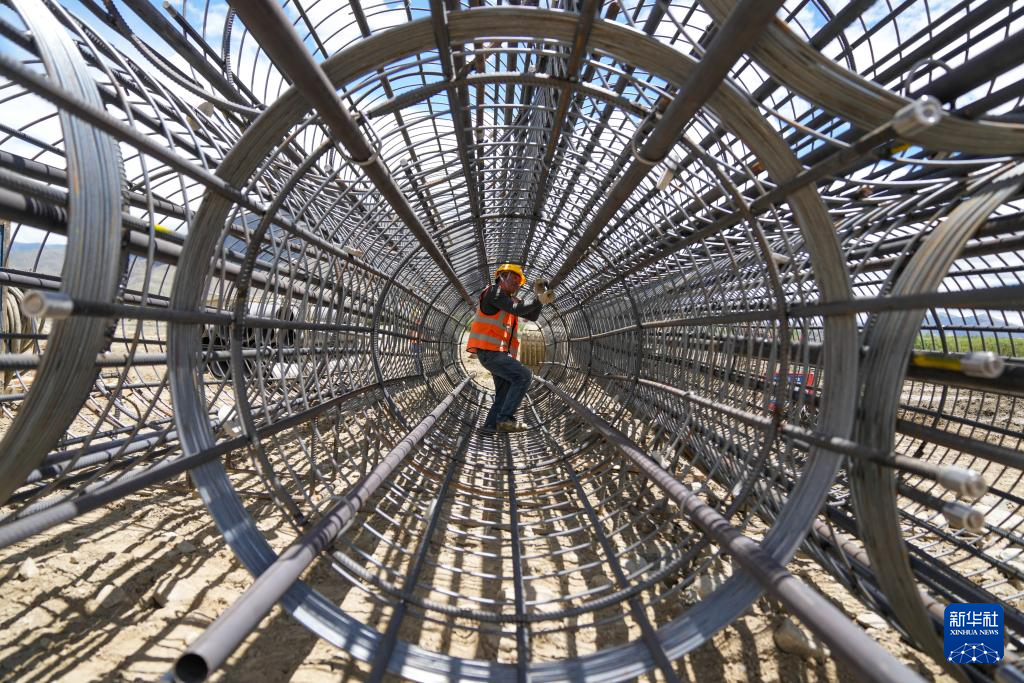 工人在薩熱路跨江大橋建設(shè)現(xiàn)場綁扎聲測管(6月18日攝)。新華社記者 晉美多吉 攝