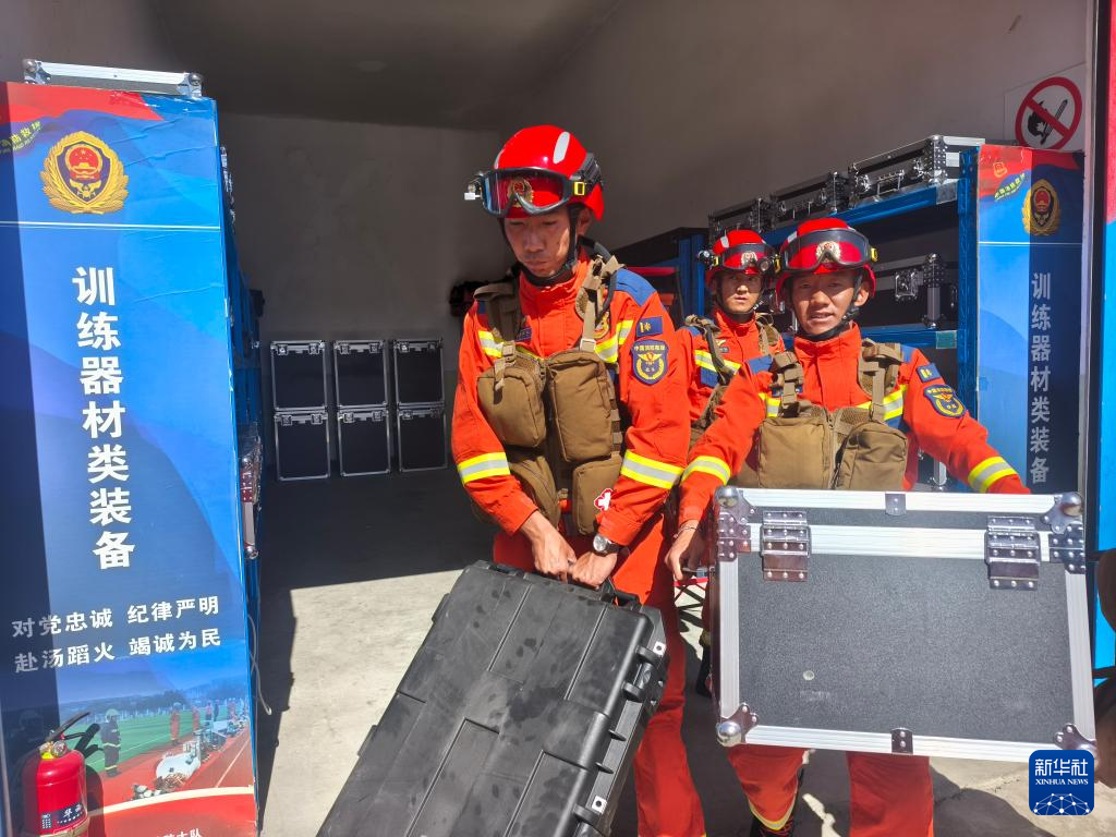 7月8日,西藏森林消防總隊日喀則大隊的消防員在整理器材,準備前往吉隆口岸救災。新華社發(fā)