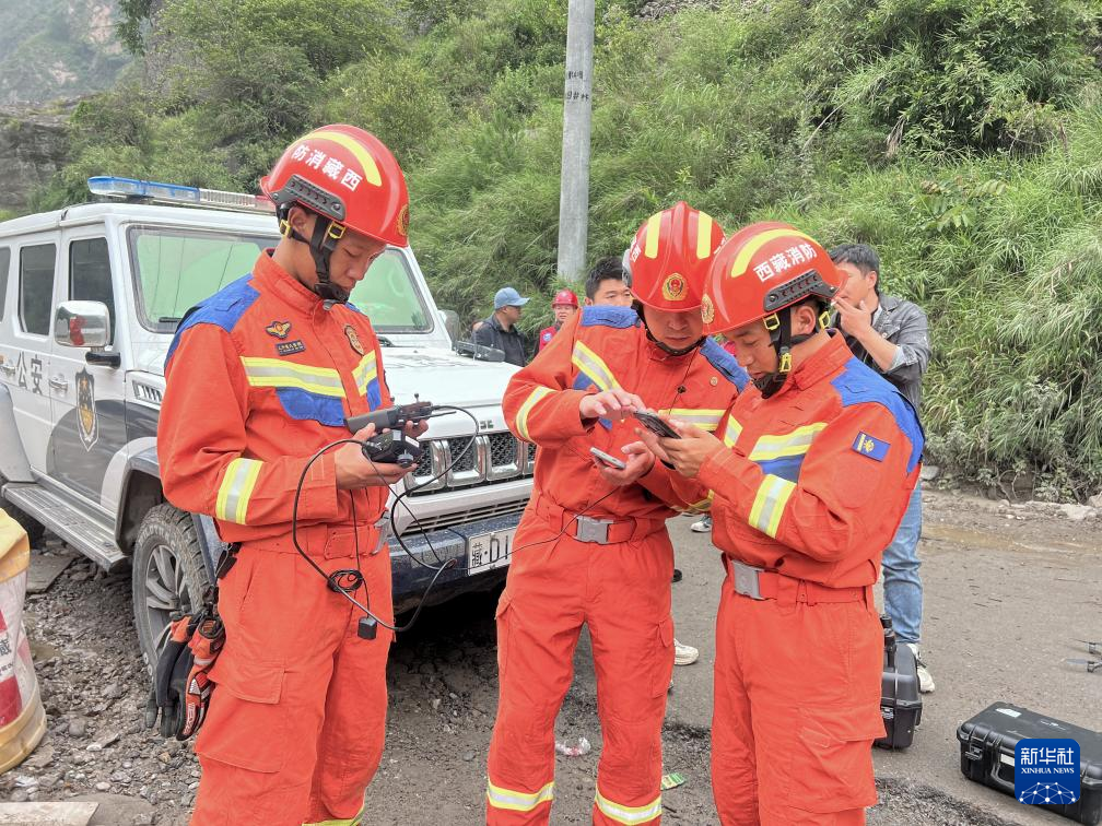 7月8日,西藏消防救援總隊救援人員在救災現場搭建4G單兵圖傳系統(tǒng)。新華社發(fā)(徐達富攝)