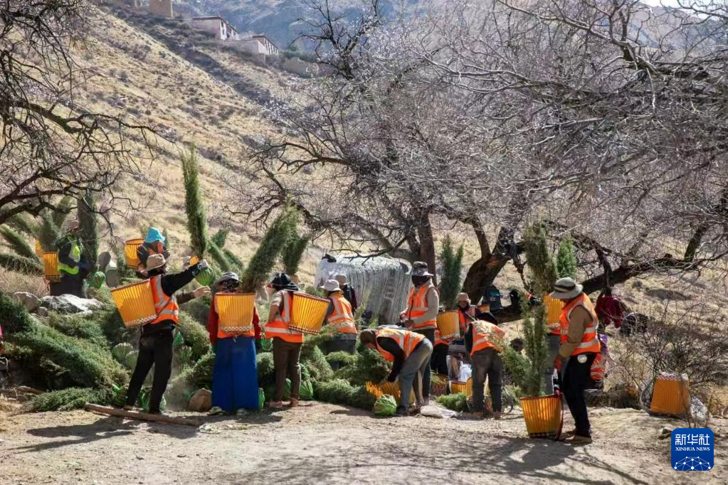 綠化養(yǎng)護工人澤仁巴西和同事們一起植樹。(受訪者供圖)