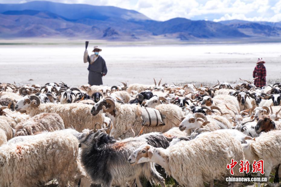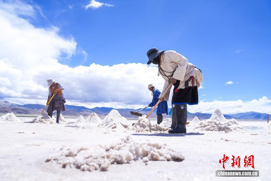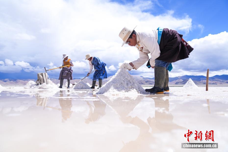 7月20日,在西藏阿里地區(qū)革吉縣鹽湖鄉(xiāng),民眾在鹽湖中采制粗鹽巴。一千多年前,阿里地區(qū)有50多家駐扎的鹽幫,將自然鹽用羊馱牛背邊放牧邊運(yùn)輸?shù)姆绞?,運(yùn)送到普蘭、日喀則、印度、尼泊爾等地,并用以物易物的方式換回青稞、磚茶、布料等日常生活所需的物品,從而孕育了遠(yuǎn)負(fù)盛名的“鹽羊古道”傳奇。近年來(lái),當(dāng)?shù)亻_(kāi)辦粗鹽巴加工廠、打造“鹽羊古道”旅游品牌等方式,使千年“鹽羊古道”煥發(fā)新生機(jī)。中新社記者 張祥毅 攝