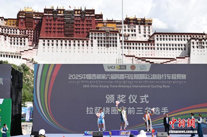 8月9日,2025中國西藏第六屆跨喜馬拉雅國際公路自行車極限賽拉薩賽段(第三賽段)完賽。本賽段為拉薩繞圈賽,起點拉薩市西藏博物館,終點布達(dá)拉宮廣場,全程約92.53公里。比賽吸引了來自中國、西班牙、哈薩克斯坦等20余支車隊。圖為斯優(yōu)泰-梵蒂尼職業(yè)隊 RAJOVIC Dusan(中)、快客洲際隊 LAAS Martin(左)、巴斯克電信職業(yè)隊 ABERASTURI IZAGA Jon(右)分別獲得本賽段第一、二、三名。中新社記者 貢嘎來松 攝