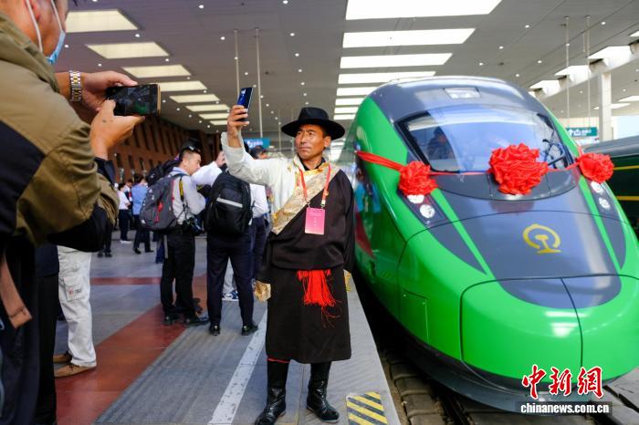 資料圖為2021年6月25日,西藏拉林鐵路開通運營,民眾在拉薩火車站與復(fù)興號拍照留念。當(dāng)日,斯朗旺扎系首發(fā)司機。中新網(wǎng)記者 江飛波 攝