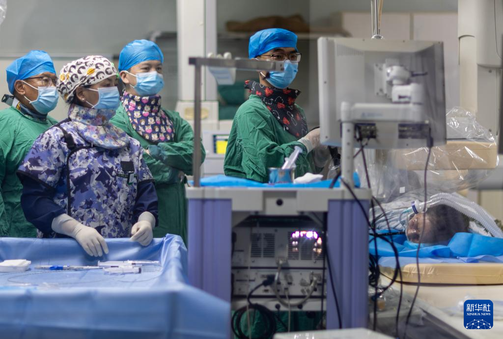 協(xié)和醫(yī)院第十批援藏醫(yī)生王強(qiáng)(左四)、第十一批援藏醫(yī)生蔣青偉(左三)和西藏自治區(qū)人民醫(yī)院醫(yī)生扎西(左一)在拉薩為患者施行內(nèi)鏡逆行胰膽管造影術(shù)(8月5日攝)。新華社記者 姜帆 攝