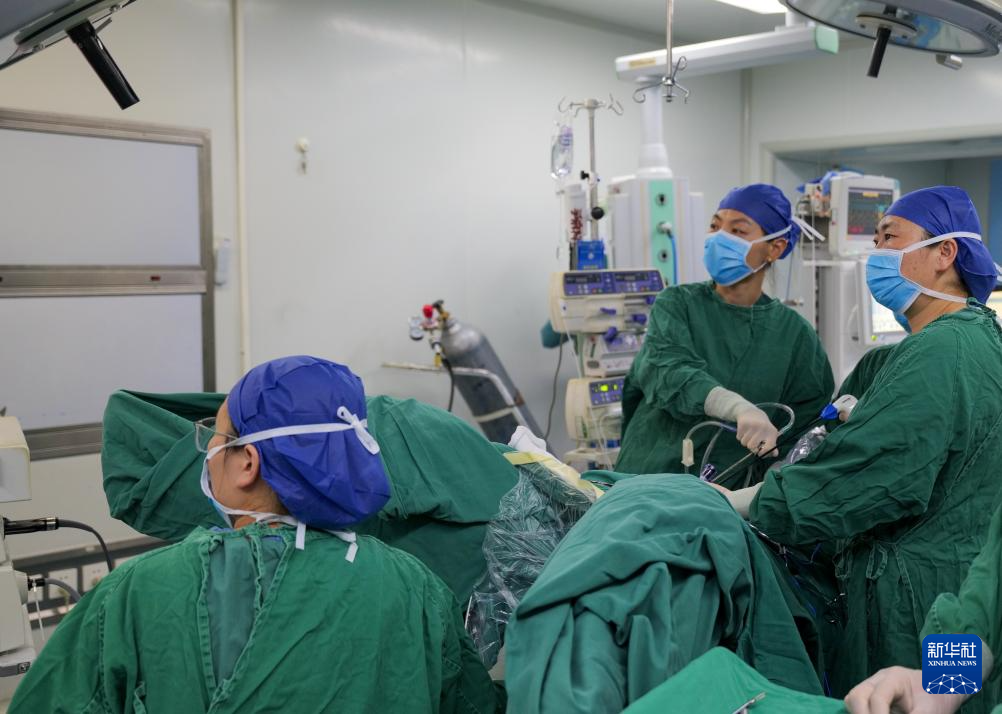 北京大學(xué)人民醫(yī)院第十批援藏婦科醫(yī)生張果(中)與西藏自治區(qū)人民醫(yī)院醫(yī)生李芳(左)一起為患者做手術(shù)(8月4日攝)。新華社發(fā)(柑丹鴦琦攝)