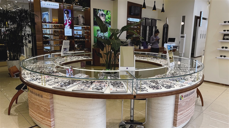 在南樓一層,瑞幸咖啡的藍(lán)色招牌與霸王茶姬的紅色燈籠相映成趣,構(gòu)筑起高原最強(qiáng)的咖啡茶飲矩陣。澳免國(guó)際美妝區(qū)內(nèi),蘭蔻、雅詩(shī)蘭黛等全球品牌專柜整齊陳列,產(chǎn)品與區(qū)外同步上新且價(jià)格一致。明廊永視眼鏡店的乳白色柜臺(tái)前,驗(yàn)光設(shè)備閃爍著科技微光,負(fù)責(zé)人彭春永介紹:“升級(jí)后加裝了藏式紋樣屏風(fēng),自動(dòng)門(mén)和LED屏讓老店煥發(fā)新顏?!?/p>