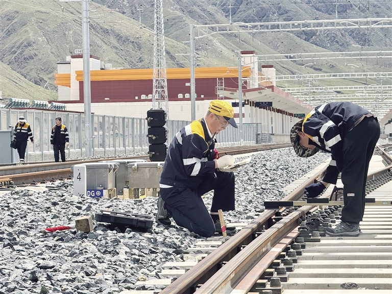 7月29日14時30分,拉林鐵路山南站,馬琳一手持道尺、一手握打號筆,一步一彎腰仔細檢查線路,額頭上沁滿的汗珠在高原陽光下熠熠生輝。這位已在青藏鐵路線上扎根29年的老線路工,用指腹反復摩挲著滾燙的鋼軌邊緣——這是他與鐵路對話的特殊方式。