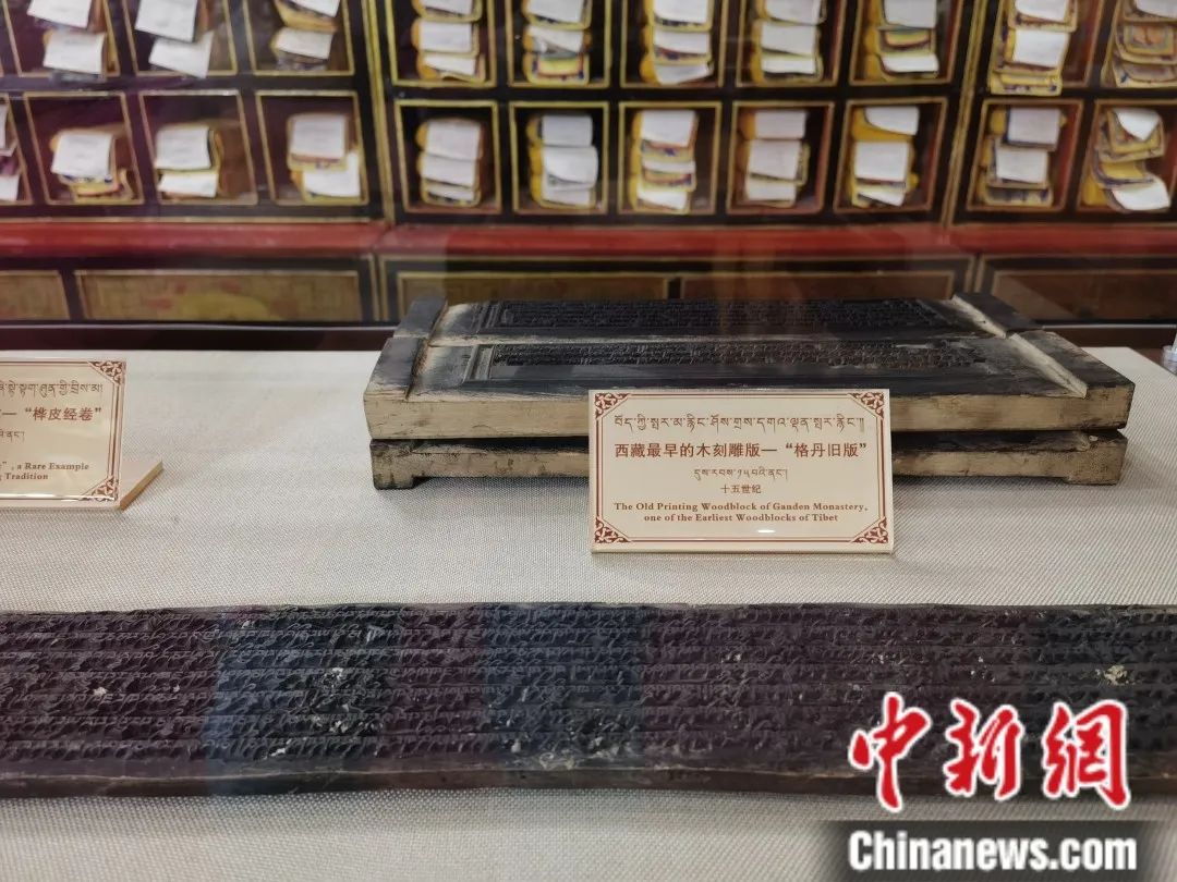 圖為西藏大學(xué)圖書館藏文古籍研究所收藏西藏最早的木刻雕版。中新社記者 趙延 攝