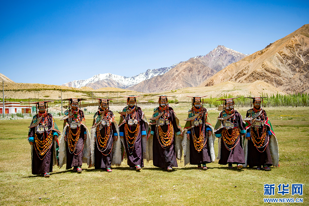 身著“普蘭服飾”的普蘭縣科迦村村民(6月10日攝)?!捌仗m服飾”,主要由袍子、披風(fēng)、頭飾、項(xiàng)鏈、腰帶、耳墜、靴子組成。其中最精美、最獨(dú)特的為婦女服飾,外形設(shè)計(jì)如同孔雀開屏,被譽(yù)為“孔雀”服飾,一套重達(dá)20多公斤,裝飾有黃金、白銀、蜜蠟、珊瑚、綠松石等。新華網(wǎng) 旦增努布 攝