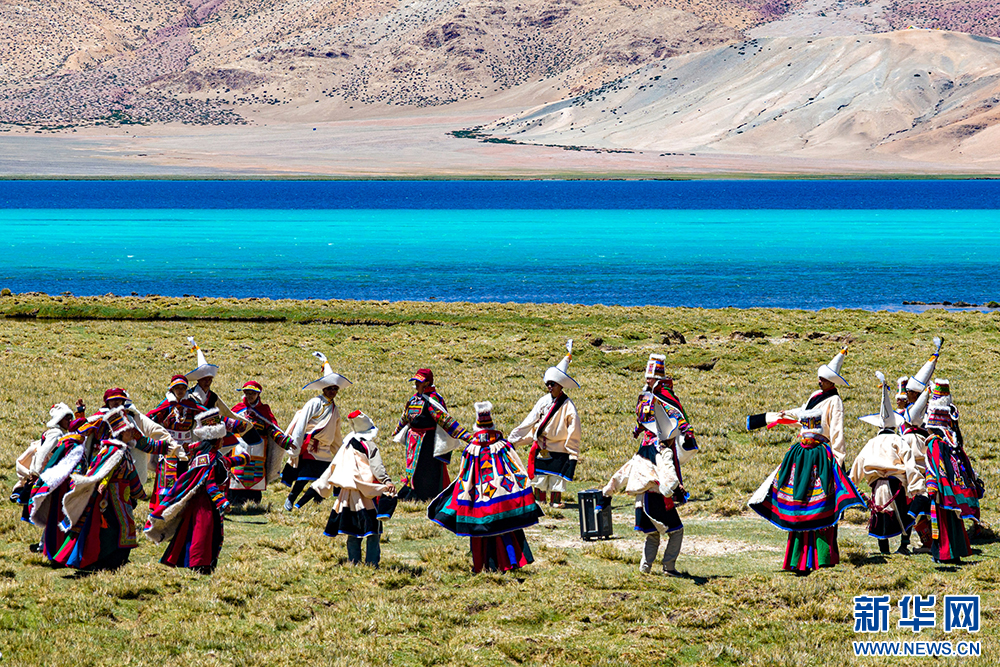 身穿自治區(qū)級(jí)非物質(zhì)文化遺產(chǎn)“森郭服飾”的改則縣群眾在湖畔跳鍋莊(6月21日攝)。“森郭服飾”被譽(yù)為“五彩彩虹服”,主要由紅、綠、黑、黃、藍(lán)五種顏色的氆氌制成。新華網(wǎng) 旦增努布 攝