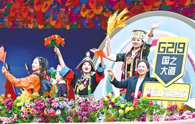 “藏源山南”彩車上的演員通過布達(dá)拉宮廣場時(shí)向人群揮手。