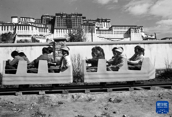 1987年10月1日,在拉薩勞動人民文化宮內(nèi)新建成的大型游樂場里,小朋友們在乘坐電動小火車。