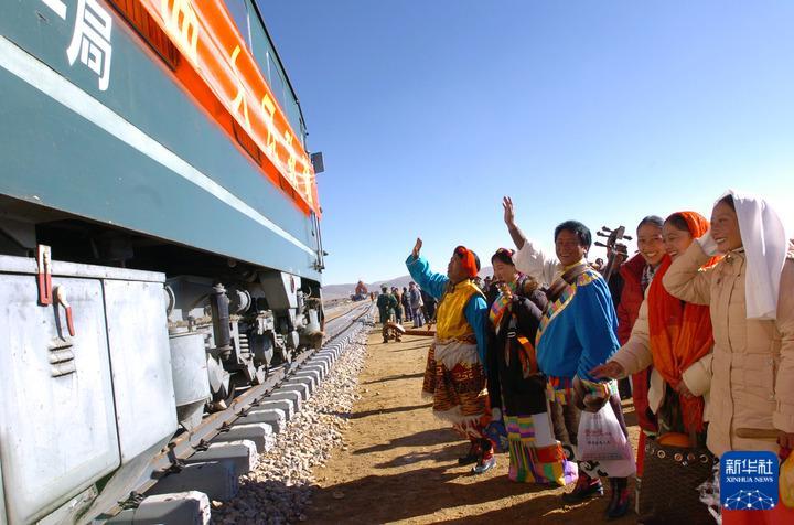 2004年10月10日,藏北群眾迎接火車抵達那曲。10月9日,青藏鐵路安多至那曲138公里鐵軌鋪設(shè)完成。10月10日,從安多出發(fā)的、西藏境內(nèi)第一列火車,于上午10時抵達當(dāng)時的藏北重鎮(zhèn)——那曲鎮(zhèn)。