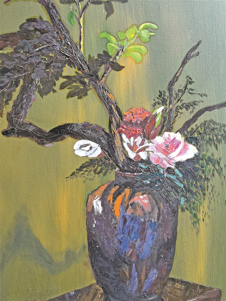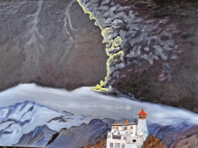 推開羽芊位于拉薩東郊的家門,目光首先被三面通體書墻溫柔捕獲。文學、歷史、自然、科學,上萬冊藏書如沉默的智者靜立。書柜一角,整齊擺放著《藏婚》《西藏生死戀》《金城公主》等十五部藏地題材作品,每一本都浸潤著高原陽光的暖意。四處打量,書桌旁立著一個畫架,未完成的油畫上,藏北草原斑斕秋色正流淌在畫布上,透露出她對光影與色彩天生的敏銳——這份未被刻意強調(diào)的油畫天賦,悄然浸染著她的文學世界。