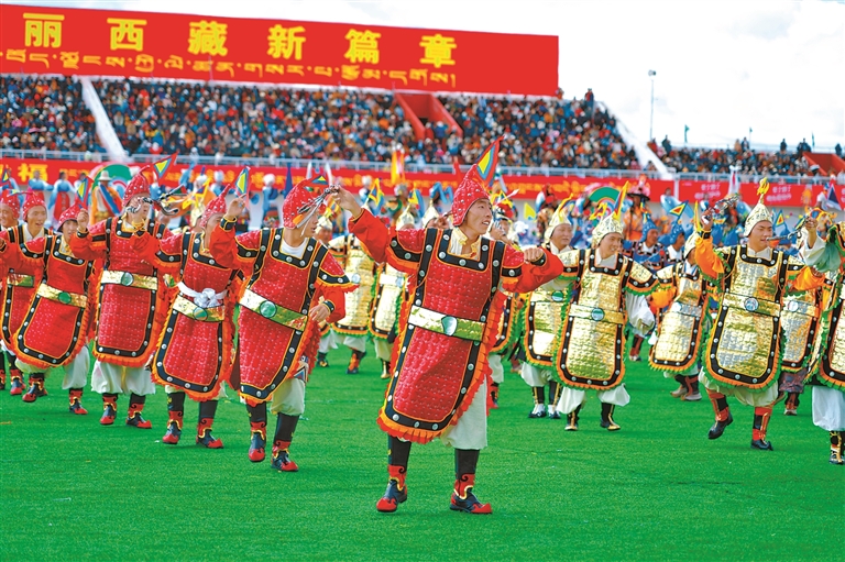 來自四川、青海及西藏本地的馬術(shù)隊(duì)英姿颯爽,躍馬揚(yáng)鞭;千人共舞《禮贊甲子》,舞步豪邁,衣袂飛揚(yáng),再現(xiàn)西藏六十年的滄桑巨變;器樂合奏《風(fēng)從浙江來·樂在那曲揚(yáng)》則巧妙融合江南韻律與草原風(fēng)情,奏響對(duì)口支援的深情厚誼;《馱鹽之歌》悠揚(yáng)響起,仿佛將人們帶回了古老的歲月,展現(xiàn)了高原兒女堅(jiān)韌不拔的精神……賽馬場(chǎng)核心區(qū)域,傳統(tǒng)馬術(shù)與現(xiàn)代藝術(shù)在這里交相輝映,引來掌聲如潮、喝彩不絕。