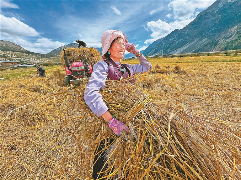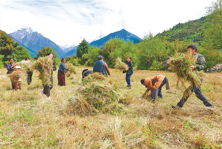 林芝市工布江達縣錯高鄉(xiāng)結(jié)巴村村民秋收場景。記者 白瑪澤旺 次仁平措 攝
