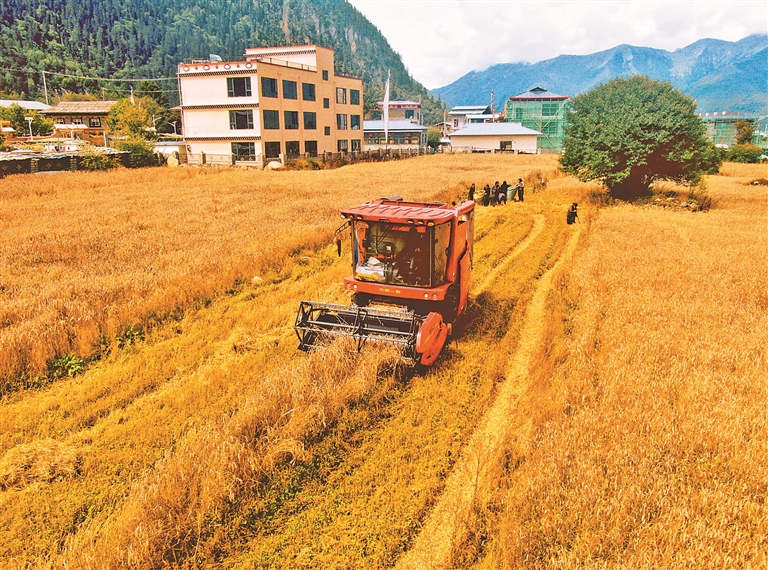 金秋的雪域高原,是一年中最動人的時節(jié)。蔚藍的天幕下,金色的青稞麥浪從山腳一直蔓延到云端。在隆隆的機械轟鳴與悠揚的勞作歌聲中,西藏各地農(nóng)區(qū)迎來了豐收的季節(jié)。