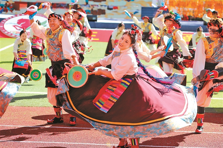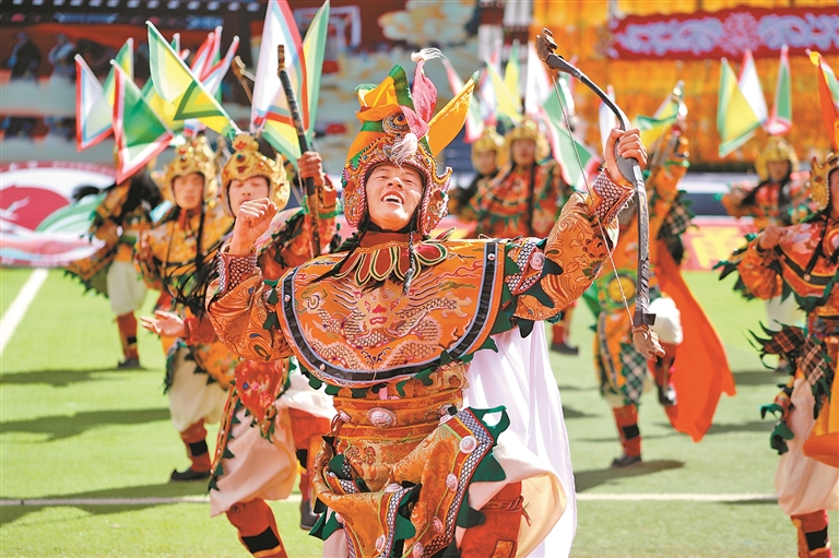 9月15日舉行的第十一屆三江茶馬文化藝術(shù)節(jié)開(kāi)幕式上,來(lái)自昌都11個(gè)縣(區(qū))的群眾代表組成游行方隊(duì),載歌載舞,繞場(chǎng)一周,熱烈激昂的丁青熱巴、豪邁威武的類烏齊嶺卓舞、優(yōu)美歡快的芒康弦子等非遺舞蹈,向現(xiàn)場(chǎng)的干部群眾和各界來(lái)賓展示了昌都獨(dú)特的傳統(tǒng)文化和熱情好客的真摯情誼。隨后的文藝表演以歌舞和情景劇的形式,從金沙江的紅色記憶,到怒江的文化傳承,再到瀾滄江的高質(zhì)量發(fā)展之光,描摹出了昌都?xì)v史文化的主要脈絡(luò)和經(jīng)濟(jì)社會(huì)發(fā)展取得的巨大成就,為現(xiàn)場(chǎng)觀眾奉獻(xiàn)了一場(chǎng)難忘的文藝盛宴。