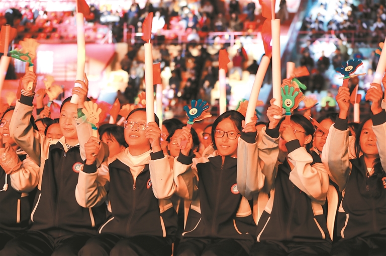 閉幕式公益演出現(xiàn)場(chǎng)熱情洋溢的學(xué)生們。