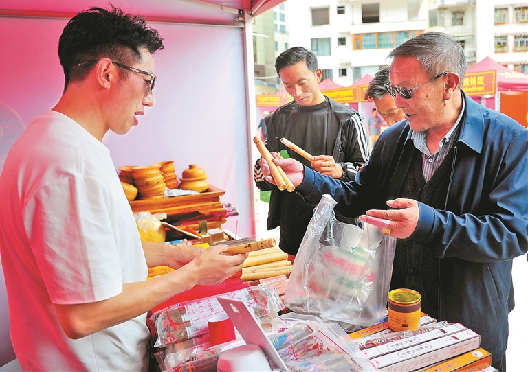 特色產(chǎn)品展銷柜臺(tái),市民正在選購(gòu)洛隆藏香。