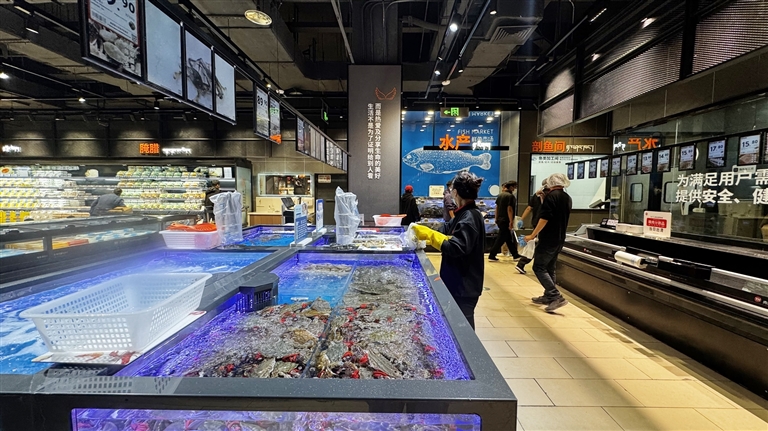 肉禽區(qū)在保留原有優(yōu)質商品基礎上,新增黑豬系列冷鮮肉、品牌冷鮮進口牛肉、原切牛排等高品質商品,同時引入藏香豬冷鮮肉、牦牛肉、本地藏雞蛋等特色商品。海鮮區(qū)域在保留本地淡水魚的基礎上,加大明蝦、鮑魚、扇貝等大海鮮的占比,同時帝王蟹、波龍、面包蟹、珍寶蟹組成“進口四大金剛”,滿足顧客對高端海鮮的需求。針對季節(jié)需求,還推出優(yōu)質大閘蟹等時令商品,滿足消費者對優(yōu)質蛋白的需求。