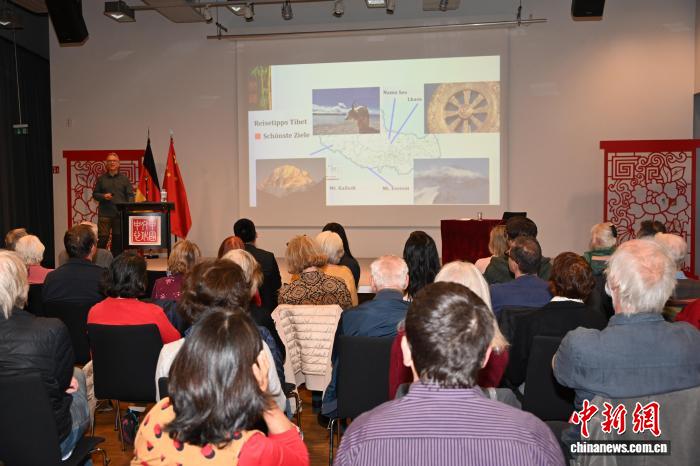 圖為米福熱情洋溢地介紹中國西藏。柏林中國文化中心 供圖