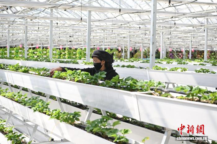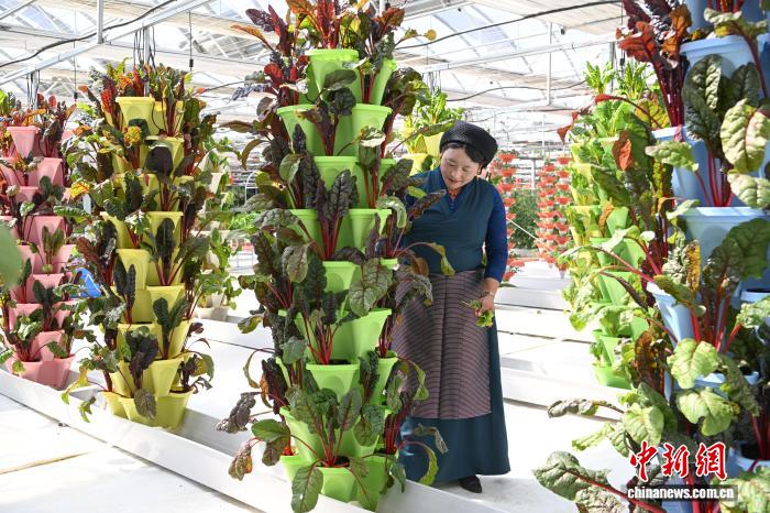 圖為當(dāng)?shù)毓と嗽谀窆たh現(xiàn)代化農(nóng)業(yè)示范園里工作。中新社記者 貢嘎來松 攝