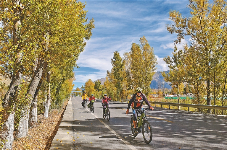 圖為自行車隊在拉薩市曲水縣秋意盎然的國道騎行。記者 次仁平措 攝