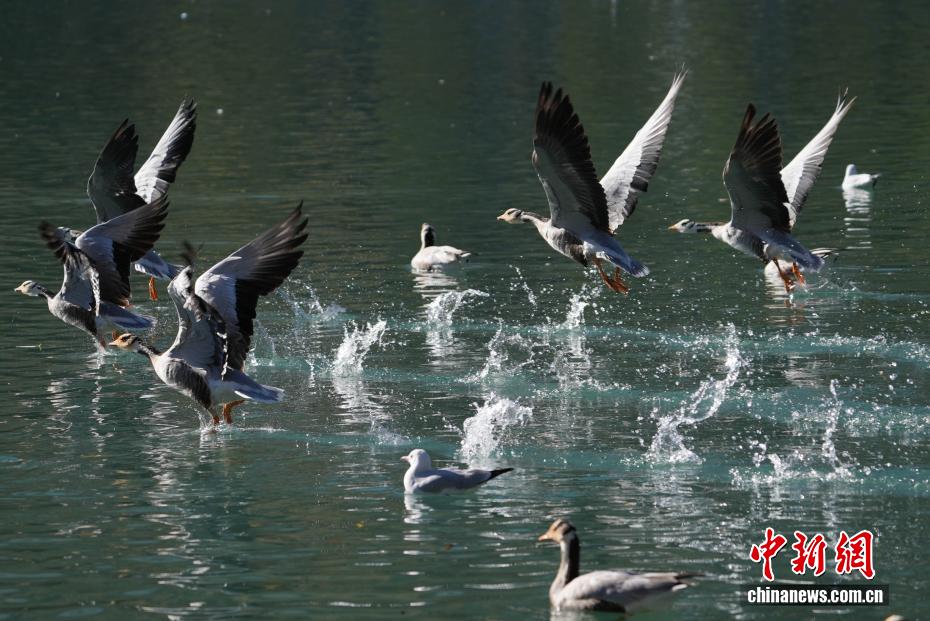 11月17日,西藏拉薩迎來(lái)大批越冬候鳥(niǎo)。拉薩河、宗角祿康公園等地,成為了它們的棲息天堂。在宗角祿康公園內(nèi),赤麻鴨、斑頭雁成群結(jié)隊(duì),時(shí)而低頭覓食,時(shí)而水中嬉戲。它們的身影引得市民和游客紛紛駐足觀賞、拍照留念,構(gòu)成了一幅人與自然和諧共生的美麗畫(huà)卷。圖為斑頭雁從宗角祿康公園上方飛過(guò)。貢確 攝
