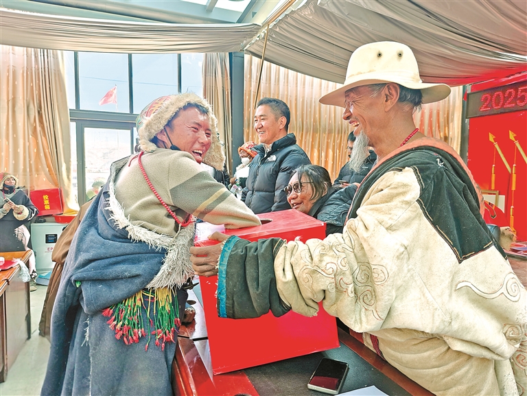 圖為熱鬧喜慶的日土縣熱幫鄉(xiāng)扎普村分房抽簽現(xiàn)場(chǎng)。通訊員 次仁拉宗 攝