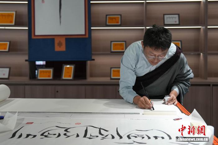 圖為西藏鄉(xiāng)村振興產(chǎn)品展示中心內(nèi)的藏文書(shū)法體驗(yàn)區(qū)。貢確 攝