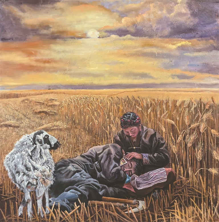 “《牧歸》是我的第一幅油畫作品,描繪的是牧民春耕回家的場景?!编u文江指著畫室一角已經(jīng)完成的作品說道。畫面上,夕陽余暉中,牧民背著傳統(tǒng)農(nóng)具趕著牦牛緩緩歸來,遠處炊煙裊裊,濃郁的生活氣息撲面而來。