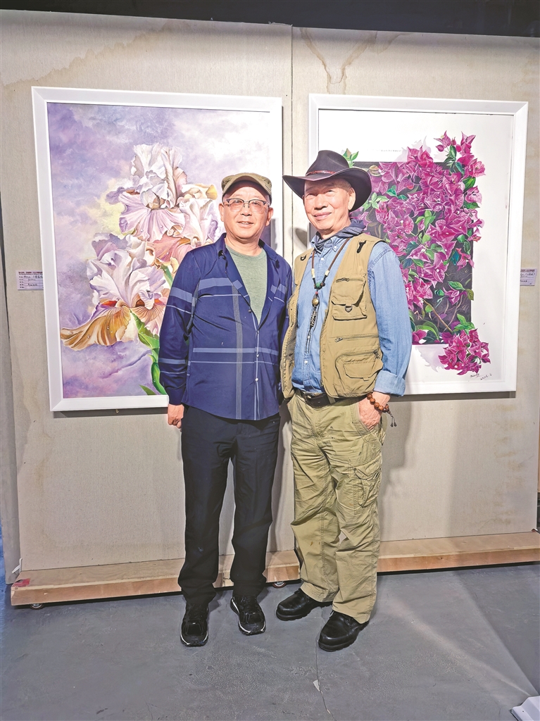 圖為鄒文江與著名軍旅畫家敬庭堯老師在作品前合影留念。