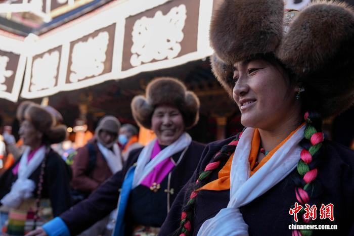 11月28日,隨著藏歷十月十五白拉姆節(jié)臨近,連日來,拉薩及周邊信眾身著色彩艷麗的藏裝節(jié)日盛裝,手持從家中精心準(zhǔn)備的頭等青稞酒、新收的青稞及新鮮水果,陸續(xù)前往大昭寺、色拉寺、哲蚌寺等寺廟朝拜祈福。大昭寺內(nèi),信眾敬獻供品后載歌載舞,歌聲悠揚、舞步輕快,盡顯節(jié)日喜悅。白拉姆節(jié)又稱 “仙女節(jié)”。相傳,白拉姆是拉薩地區(qū)的保護神,是藏傳佛教最高護法神之一班丹拉姆的女兒。白拉姆曾與大昭寺護法神赤尊贊相互愛慕并私定終身,其母親班丹拉姆發(fā)現(xiàn)后,赤尊贊被趕到拉薩河南岸,每逢藏歷十月十五日,二人才能隔河相見一次。圖為白拉姆節(jié)臨近之際,信眾在大昭寺內(nèi)敬獻供品后載歌載舞的場景。貢確 攝