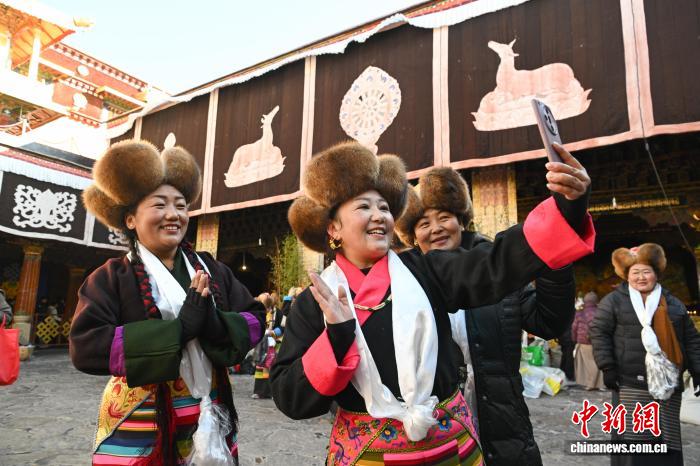 隨著藏歷十月十五白拉姆節(jié)(又稱“仙女節(jié)”)臨近,11月28日,西藏拉薩的婦女們在大昭寺跳完傳統(tǒng)舞蹈后自拍留念,迎接“仙女節(jié)”到來?!跋膳?jié)”即吉祥天母節(jié),藏語稱“白來日追”。相傳藏傳佛教最高護(hù)法神之一班丹拉姆的女兒白拉姆,不顧母親的反對與赤尊贊私定終身,班丹拉姆一怒之下將赤尊贊趕到拉薩河南岸,規(guī)定二人僅每年的藏歷十月十五日相見。中新社記者 貢嘎來松 攝