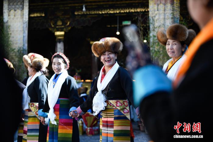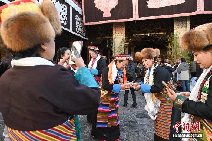 隨著藏歷十月十五白拉姆節(jié)(又稱“仙女節(jié)”)臨近,11月28日,西藏拉薩的婦女們在大昭寺互敬青稞酒,迎接“仙女節(jié)”到來?!跋膳?jié)”即吉祥天母節(jié),藏語稱“白來日追”。相傳藏傳佛教最高護(hù)法神之一班丹拉姆的女兒白拉姆,不顧母親的反對與赤尊贊私定終身,班丹拉姆一怒之下將赤尊贊趕到拉薩河南岸,規(guī)定二人僅每年的藏歷十月十五日相見。中新社記者 貢嘎來松 攝