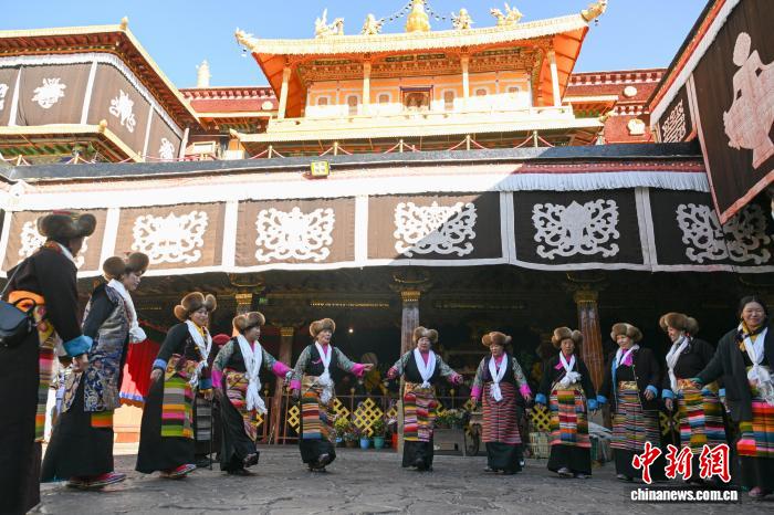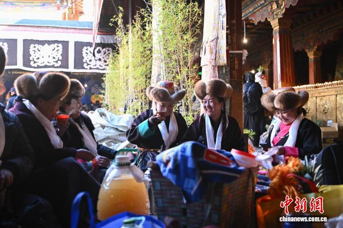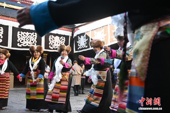 隨著藏歷十月十五白拉姆節(jié)(又稱“仙女節(jié)”)臨近,11月28日,西藏拉薩的婦女們在大昭寺跳完傳統(tǒng)舞蹈后休息,迎接“仙女節(jié)”到來?!跋膳?jié)”即吉祥天母節(jié),藏語稱“白來日追”。相傳藏傳佛教最高護(hù)法神之一班丹拉姆的女兒白拉姆,不顧母親的反對與赤尊贊私定終身,班丹拉姆一怒之下將赤尊贊趕到拉薩河南岸,規(guī)定二人僅每年的藏歷十月十五日相見。中新社記者 貢嘎來松 攝