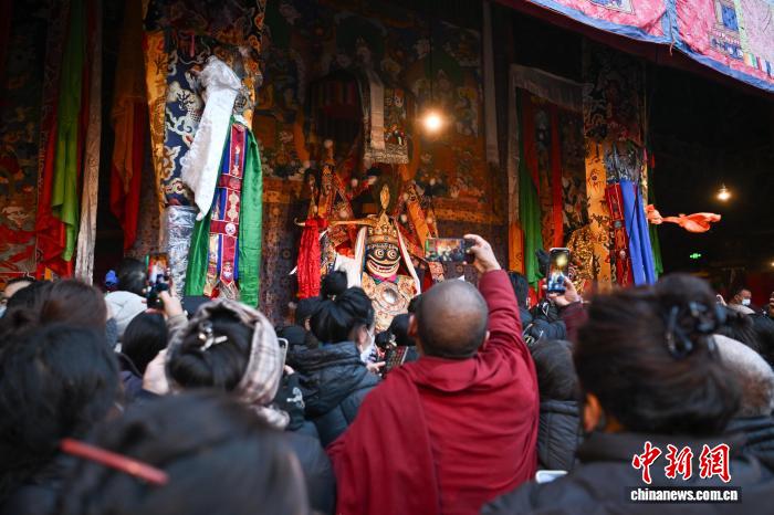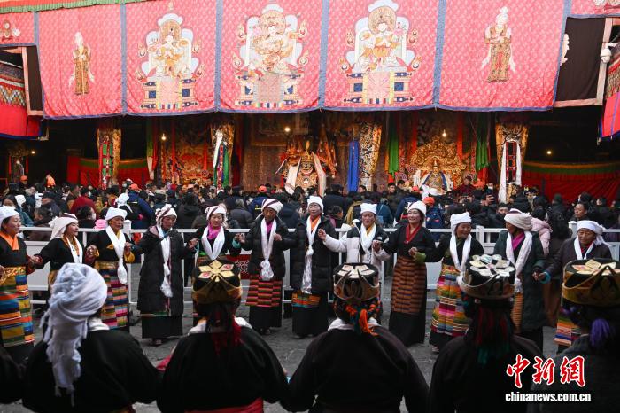 圖為身著民族服裝的信眾在大昭寺內載歌載舞。中新社記者 貢嘎來松 攝