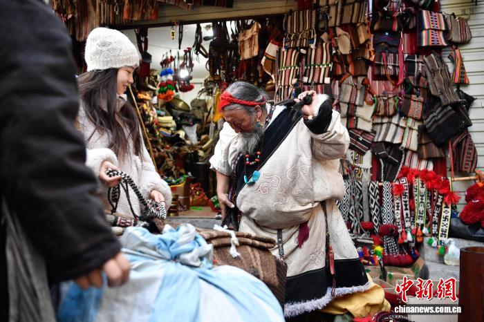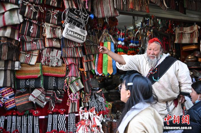 圖為藏式老物件店主次仁羅布向游客推薦藏式氆氌側(cè)掛包。中新社記者 貢嘎來(lái)松 攝