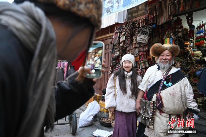 圖為藏式老物件店主次仁羅布與游客合影。中新社記者 貢嘎來(lái)松 攝