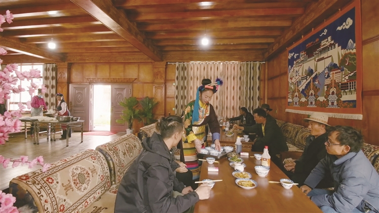 作為自治區(qū)級非遺傳承人、芒康縣“婦女致富帶頭人”的卓瑪拉姆,于2010年開辦鹽井果拉叢農(nóng)家樂,憑借著正宗的加加面風(fēng)味和熱情的服務(wù),逐漸積累了口碑。2012年,在各級政府的支持下,她采用“民族特色餐飲+鄉(xiāng)村旅游接待”的經(jīng)營模式,生意日益紅火。2017年,通過貸款300萬元、自籌160萬元翻建了農(nóng)家樂,將其升級為綜合型的民族特色餐飲店,經(jīng)營規(guī)模大幅擴(kuò)大,最多時日接待游客達(dá)300余人。