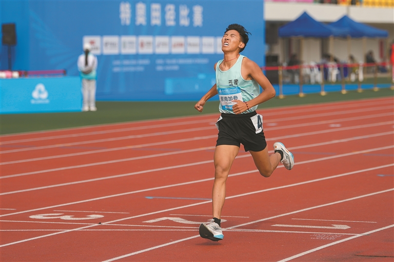 12月11日,索南加參在全國殘?zhí)貖W會特奧田徑比賽男子16—21歲組800米決賽第7組比賽中率先沖過終點。新華社記者 楊晨光 攝