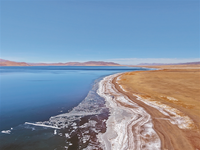 4只、7只、13只……藏原羚矯健的身影接連閃現(xiàn),照片在群里刷屏。緊接著,鏡面般澄澈的蓬錯(cuò)映入眼簾,湖岸線沿著317國(guó)道蜿蜒舒展。