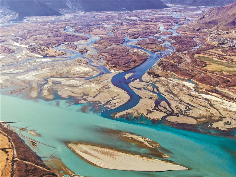 這份動(dòng)人的景致,是西藏始終堅(jiān)守生態(tài)保護(hù)的成果。冬季,雅魯藏布江流域降水減少,流速減緩,水體含沙量大幅降低,河床泥沙沉淀,水體澄澈度達(dá)到全年最高,加之礦物質(zhì)與水體交融,高原純凈的空氣讓陽光穿透性更強(qiáng),江水的色彩層次被放大,造就了這幅江水為墨、沙洲為紙的自然畫卷。