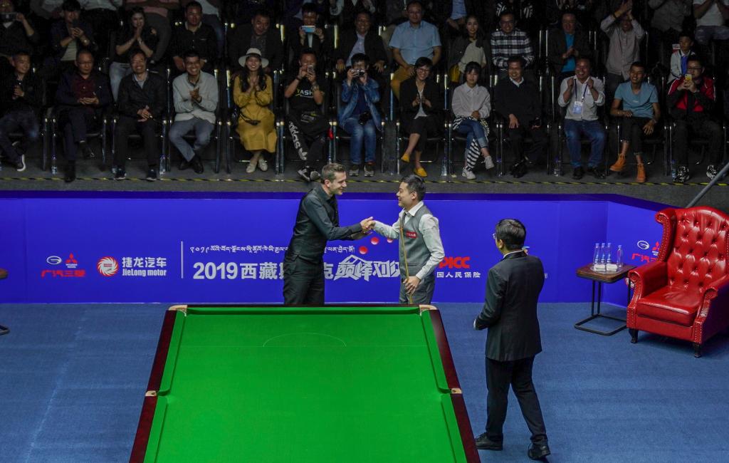 2019西藏斯諾克巔峰對(duì)決比賽中,塞爾比(左一)祝賀丁俊暉單桿打出147的滿(mǎn)分。新華社記者 晉美多吉 攝